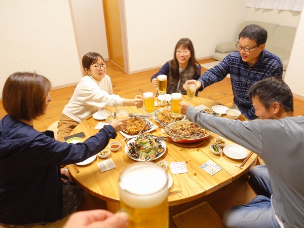 そしてフルパワーで夕飯の仕上げを頑張ったら、みんなワイワイおしゃべりしてるところに料理が登場 美味しそうだ~!ってまた最後の力振り絞った甲斐ある笑顔が集い良いことです。では今夜もみんな飲み物手にしたら、ラストツアーに!ってことで・・・
