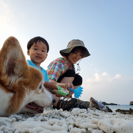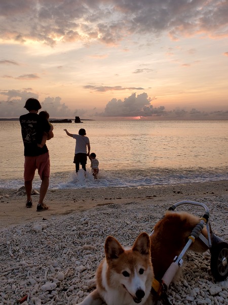 お散歩楽しみにしていた朝はバッチリお目覚めバナタくんと 起きて~!ってなかなか起きないバナアちゃん。なのでバナタくんとソファに並んで座っては おはようオッチャン!って 誰がオッチャンやねん!ってな感じで待ってたら、ようやく抱っこで登場みんな揃ってお外へと。海あそびセット持ったバナタくんは嬉しそうに、そして車椅子タプーちゃんをチラチラ見ながら海目指し、プキビーチでは早速サンゴをすくっては嬉しそうにしておられます。