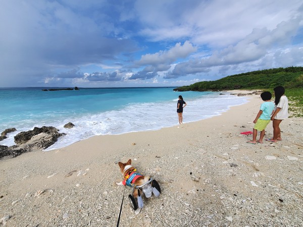 そんな雨上がりのお散歩は 車椅子凄いね!ってお部屋の中での動けないタプーちゃんから一転、元気いっぱい歩く姿に感激しながら海目指して行きますよ。そしてゴーゴーと波音響くプキビーチにやって来たら、確かにこれは泳いじゃダメだ!ってザッパンザッパンしております。なのでタプーちゃんには波打ち際から遠くでお休みいただいて、果敢に攻めるのはクミさんひとり・・・