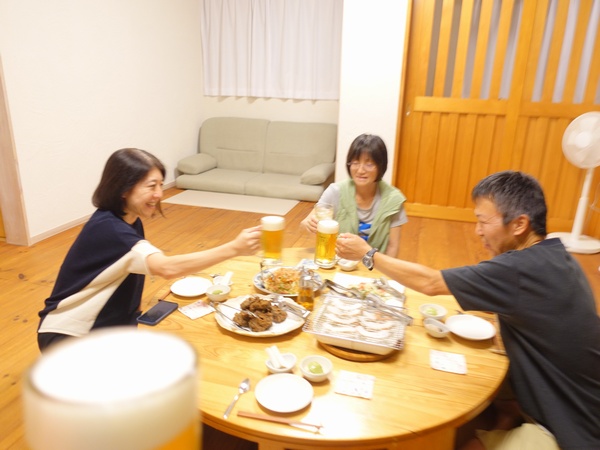 ではでは乾杯に向けて準備してってくださいなということで僕らも夕飯準備頑張ったら、出来上がって料理が登場 ヤッター!!って大喜び過ぎなユウコさんだし 子供か!って言っては笑ったら、残念パーントゥに!ってことで・・・