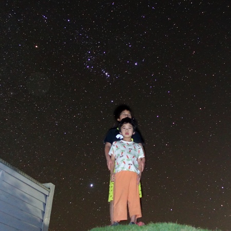 ではさっきからミナトくんが星見たいって言ってるのをおしゃべり優先でストップしてたので、部屋の灯り消して外に出たら 今日は凄いな!ってバッチリな星空広がってるから嬉しそうに見上げたり星空写真撮ったり ミナト動かないで!って動かぬ星と動く子供を・・・
