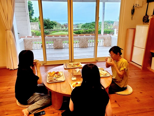 晴れを願った朝は残念ながら窓に雨粒ついてる朝となってるけれど、ひとまず朝食準備から始めましょ。そして 出来ましたよ~!の声にお部屋から登場のパイセンとエリさんと おはようございます!って声掛け合ったら、いただきますと手を合わせましょ。