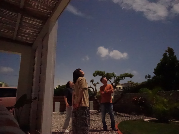 そんな夜は最後の夜だしより一層帰りたくなくなっちゃっておりまして、そんな流れで移住の話は 今か老後かどっち!?って話だったりお金の管理の話で まさかAIじゃないよね!?って 17年前の旧式のAIじゃない!?ってカクカクロボット演じてパイセン弄って大笑い。そして今夜もタプーちゃんがそろそろ歯磨きだよって仰るのでちょっと待ってくださいなって、星じゃなくてアレ見てみよう!って笑いながらみんなでデッキに出たら、まさかの昨日と一緒!ってのにビックリそして大笑いでね。お庭に出たら ほらパイセンお願い!って エイ!って投げたりちょっとオブラートに包んだ表現になりますがワチャワチャやって、そして見上げる空は晴れてるけれど・・・