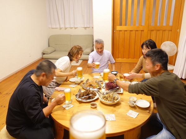 うまい!って飲んだり 初オリオンだ!ってシゲミさんも嬉しそうにグイッとやったら手を合わせては、もちろんこれからどうぞって大好物は、これこれ!って、美味しい~!ってとってもいい顔並びます。お次は これはチーズが! 0%です!って笑ったり、初宮古なお二人さんには初めてのだったり これはビールが進む!ってのだったり大喜びでありまして。