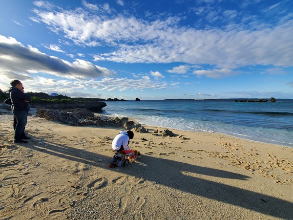 そんなビーチの光景は、昨日と一緒で貝殻拾いのトモコさんからのシュンシュンも参戦しては波と遊ぶ姿がありまして、だけど大波にやられて靴濡らしちゃってるし、瞬発力のシュンなのに!って笑ってます。そして荷下ろしして出港の船をジュンさんと眺めながら語らいのひとときは、小さい離島には住めないな!って話だったり、この時期はのんびり出来ていいなあ!って慌ただしい日常を離れるのには良い季節だねって語ったり。