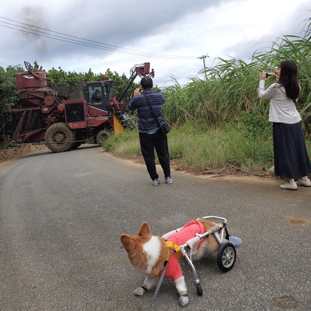 タプーちゃんもあれから色々あったからねって語ったら、それじゃあ車椅子タプーちゃんとお散歩行きますかってことで準備して、張り切って出発見送ります。そんな6年ぶりのお散歩は、いつものコースと違ったようでありまして、帰って来たら サトウキビの収穫見て来たよ!って・・・