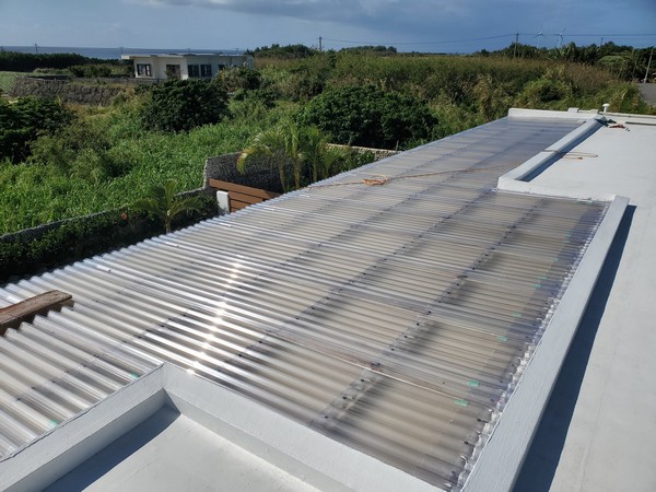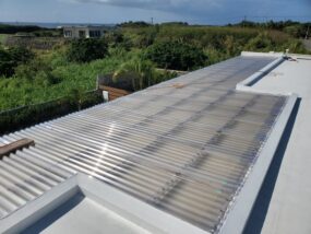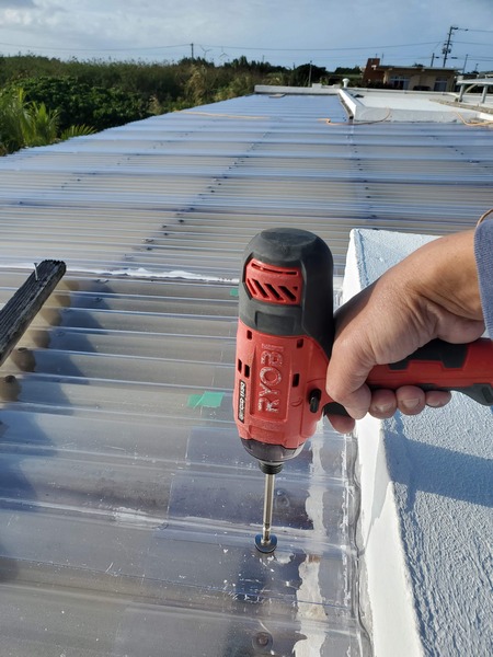 早起きだったしちょっと時間あるしアレが出来るかな、でも中途半端になるかな、バタバタしちゃうかな、えぇいやっちゃえ!ってことで作業着に着替えて脚立出しては屋上へ。もちろん途中で止まっていたデッキ屋根の作業でありまして、順番にポリカの板を上げてったら、手前の面を合わせて微調整していって、やり直し効かないし細かいところもキチンと合わせて並べたら、ご覧の通り・・・