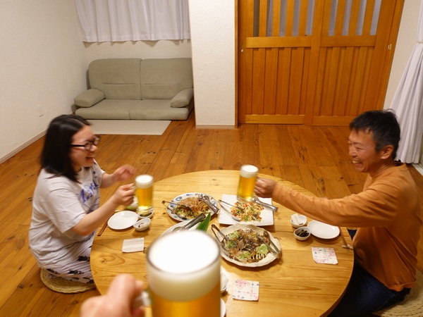 そこからはまたスポーツの話で 個人より団体、記録より対戦が好き!って話でワイワイやっては楽しんだり、職場や友達のあれこれ語って笑ったり賑やかなひととき楽しみます。そして今夜もガッツリ食べたらごちそうさまして二次会は、タプーちゃんナデナデしつつ車の話で 島の人の運転が!って仰るのでメグミさんと二人体験談を語っては 何それ怖い~!ってので笑ったり、台風や塩害で朽ちてく車事情を語っては 明日ウチのバモス見てごらん!って過酷な島の環境語ったり。