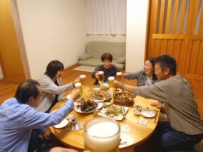 そして料理が完成 出来ましたよ~!って声にみんな集まって来たら 美味しそう~!って嬉しそうな笑顔が並びます。ではみんなジョッキを手にしたら、初めてと3日目と10年ぶりに!ってことで・・・