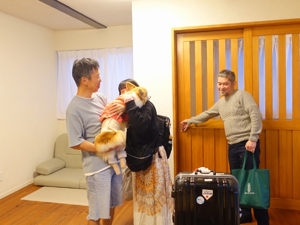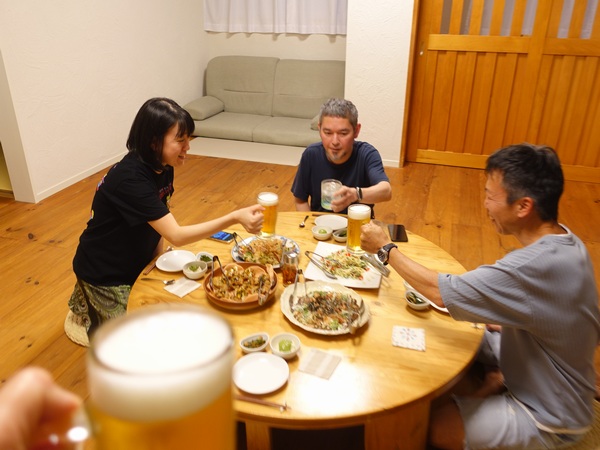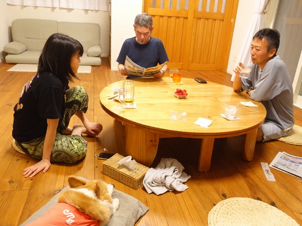 そこからも雨が降ったり止んだり横殴ったり、そんな荒れた天気の影響で夕方 飛行機遅れてまだ宮古空港にいて!ってゲストさんから連絡あって、まあこんな天気だし慌てずいらっしゃいということで、ひとまず無事島に降りれただけで良しとしましょうか。そしてそろそろ暗くなって来たよって頃になってレンタカーが到着 タプーちゃん久しぶり~!って、なんとか無事来れました!って本日のゲストさんは、2年ぶりのハラちゃんと初めましてのケイイチさん。まあとにかく入って入ってということで、入ったならば 会いたかったよ~!!って・・・