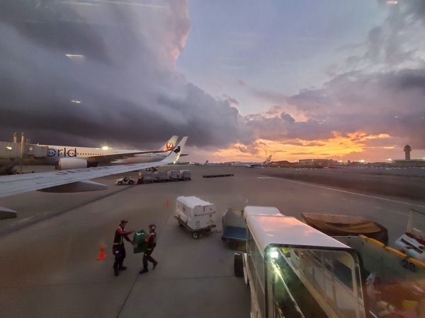 そんな着陸後の飛行機の窓から見える景色は台風迫る感じの景色でね、昨日までなら1時間前には日が沈んでたから時差ボケ的な感じだなあって、17時50分の夕焼けと怪し過ぎる真っ黒な雲って景色となってます。そんな景色をバックに僕らの目の前では、那覇からの飛行機に乗せ換えるため荷物が運ばれたり、これだけは丁寧に手から手へ・・・