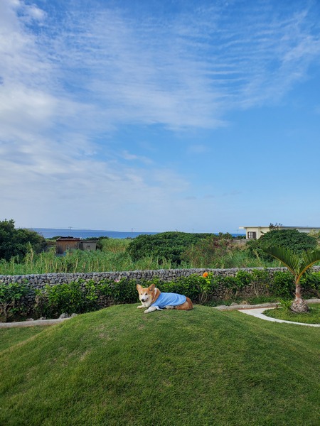 またまたずっと続いていた風強しな日々ですが、ようやく落ち着き空もバッチリ青いから、タプーちゃんのお散歩は気分を変えて道路の向こう側に行ってみましょうか。