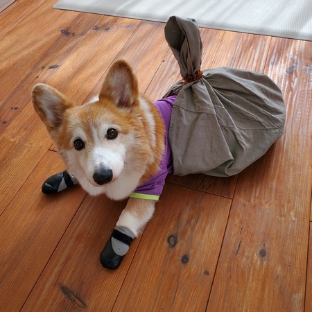 帰って来たら食べた分を消費すべく庭仕事の準備しなきゃなんだけど、タプーちゃ~ん!ってメグミさんの叫び声が響いてね、やっちまったな!って足の擦れ防止で履かせてる靴下脱いで擦れた部分をガシガシやっちゃってたのでね、応急処置してからの・・・