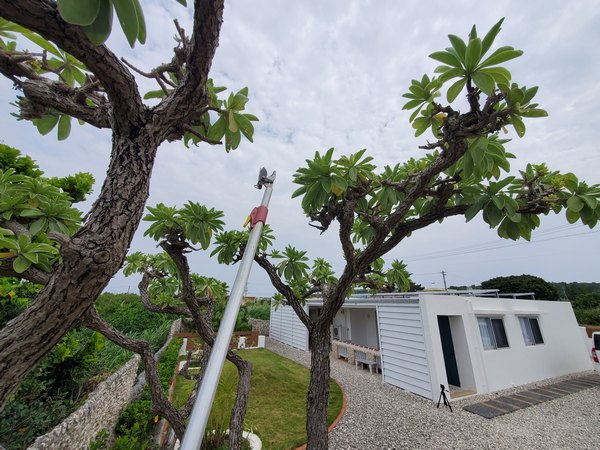 そこからはふと見上げて結構花が咲いて来たなって、とはいっても嬉しかったり眺めたりするヤツではなくてやっかいなヤツなので、脚立と高枝切り鋏持って来たら、高いところから・・・