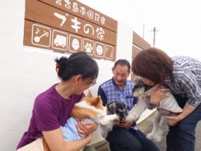 ごちそうさましたら帰り支度をボチボチと、そして準備万端整ったら最後にワンコ達との触れ合いタイムを楽しんでから、ちょっとだけ青混じりになって来た空バックに・・・